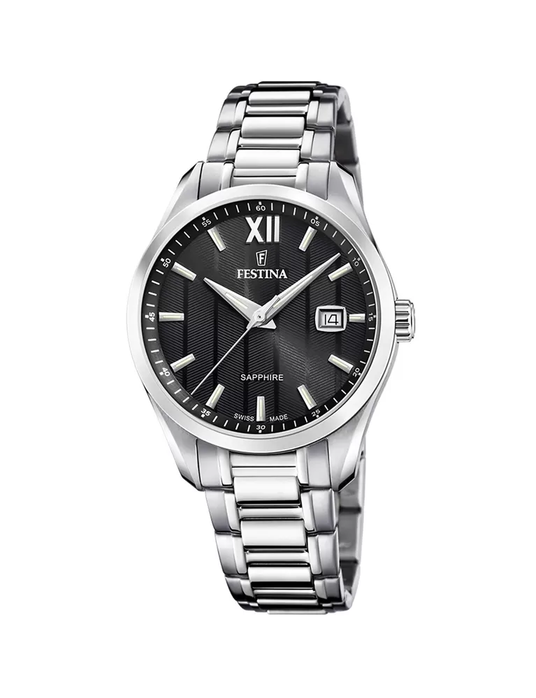 Pokud hledáte elegantní hodinky se švýcarským strojkem a za skutečně dostupnou cenu, kolekce Festina Swiss Made je více než příhodnou volbou. Festině se v ní podařilo skloubit hned několik oblíbených vlastností, kterými si vás hodinky získají. Pánský model Festina F20026 nabídne především vysoce elegantní vzhled, který bude zdárně sekundovat i společenskému obleku, safírové sklíčko vysoce odolné proti poškrábán a voděodolnost 5 ATM, což stačí pro běžné mytí rukou, déšť či rychlou sprchu. Do bazénu si však hodinky sundejte. Decentní reliéfní úprava číselníku dodává hodinkám příjemné ozvláštnění, aniž by narušila společenský status hodinek. V pouzdru z ušlechtilé oceli tiká švýcarský quartzový strojek Ronda 705. Čisté linie hodinek umocňuje také přítomnost pouze hodinové, minutové a vteřinové ručky. Praktickou stránku pak doplňuje ukazatel data i propracovaný ocelový tah s překlápěcím zapínáním.