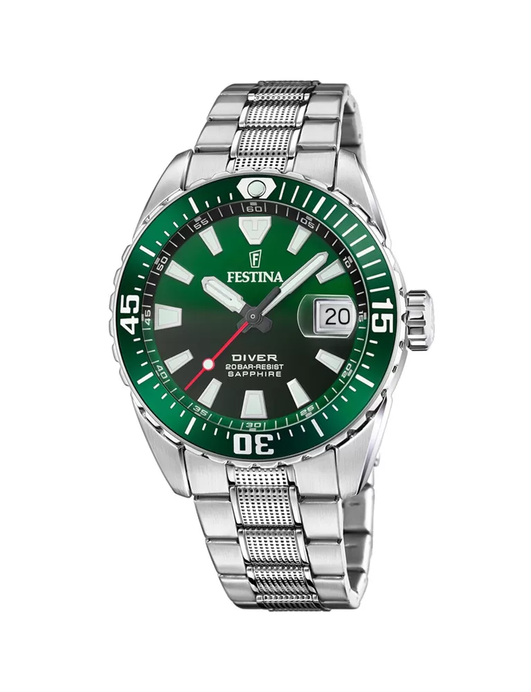 Hledáte doplněk hodný pravého gentlemana? Tím pravým jsou pánské hodinky Festina, kterými tato španělská značka vzdává hold tradičnímu hodinářství. Jejich zelený ciferník krytý safírovým sklíčkem zdobí luminiscenční ručičky a indexy, které zajišťují perfektní čitelnost času i za snížené viditelnosti. Na pozici 3 najdete ukazatele data. Pouzdro korunované výraznou lunetou je vyrobené z té nejkvalitnější ušlechtilé oceli. Rozhodně oceníte i voděodolnost až do 20 BAR, díky které si můžete s hodinkami zaplavat a jsou vhodné i pro potápění. Festina necílí na milovníky vysoké hodinařiny, ale na muže, kteří chtějí dostupné hodinky v nadčasovém designu, který Festina rozhodně umí.