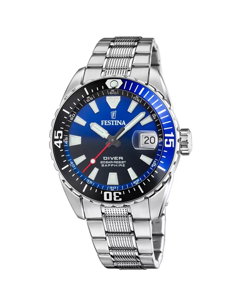 Pánské hodinky Festina 20669/5 z řady Diver jsou moderním modelem vyznačujícím se jednoduchým a elegantním provedením. Hledáte doplněk hodný pravého gentlemana? Tím pravým jsou pánské hodinky Festina, kterými tato španělská značka vzdává hold tradičnímu hodinářství. Jejich modrý ciferník krytý safírovým sklíčkem zdobí luminiscenční ručičky a indexy, které zajišťují perfektní čitelnost času i za snížené viditelnosti. Na pozici 3 najdete ukazatele data. Pouzdro korunované výraznou lunetou je vyrobené z té nejkvalitnější ušlechtilé oceli. Rozhodně oceníte i voděodolnost až do 20 BAR, díky které si můžete s hodinkami zaplavat a jsou vhodné i pro potápění.